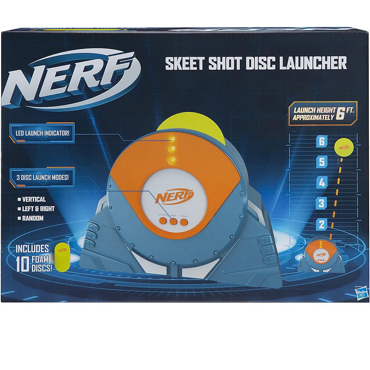 • BEWEGLICHES ZIEL: Der Launcher feuert Schaumstoffscheiben in die Luft, die mit (separat erhältlichen) Nerf Blastern getroffen werden müssen.