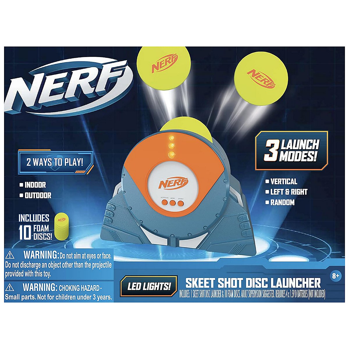 Der elektronische Nerf Skeet Shot Disc Launcher wirft Schaumstoffscheiben in 3 Modi (vertikal, horizontal, zufällig) in die Luft, um deine Zielgenauigkeit zu trainieren.