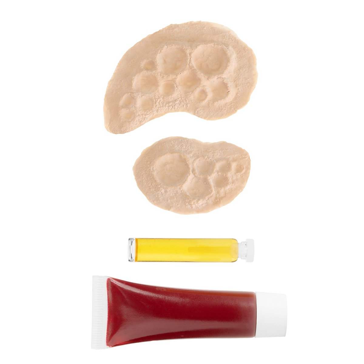 Attenzione! Non adatto a bambini di età inferiore a 36 mesi. Attenzione! Pericolo di soffocamento a causa delle piccole parti che possono essere ingerite. Il prodotto non deve essere utilizzato in caso di allergie agli ingredienti specificati. Non utilizzare se si è allergici a uno qualsiasi degli ingredienti. Il lattice è un prodotto naturale e in rari casi può scatenare un'allergia. Non utilizzare in prossimità degli occhi o negli occhi. Non applicare direttamente sulle labbra o sulle mucose. La soluzione è infiammabile e infiammabile. Non adatto al consumo. Fate attenzione ai tessuti e alle superfici: il sangue finto può causare macchie permanenti.