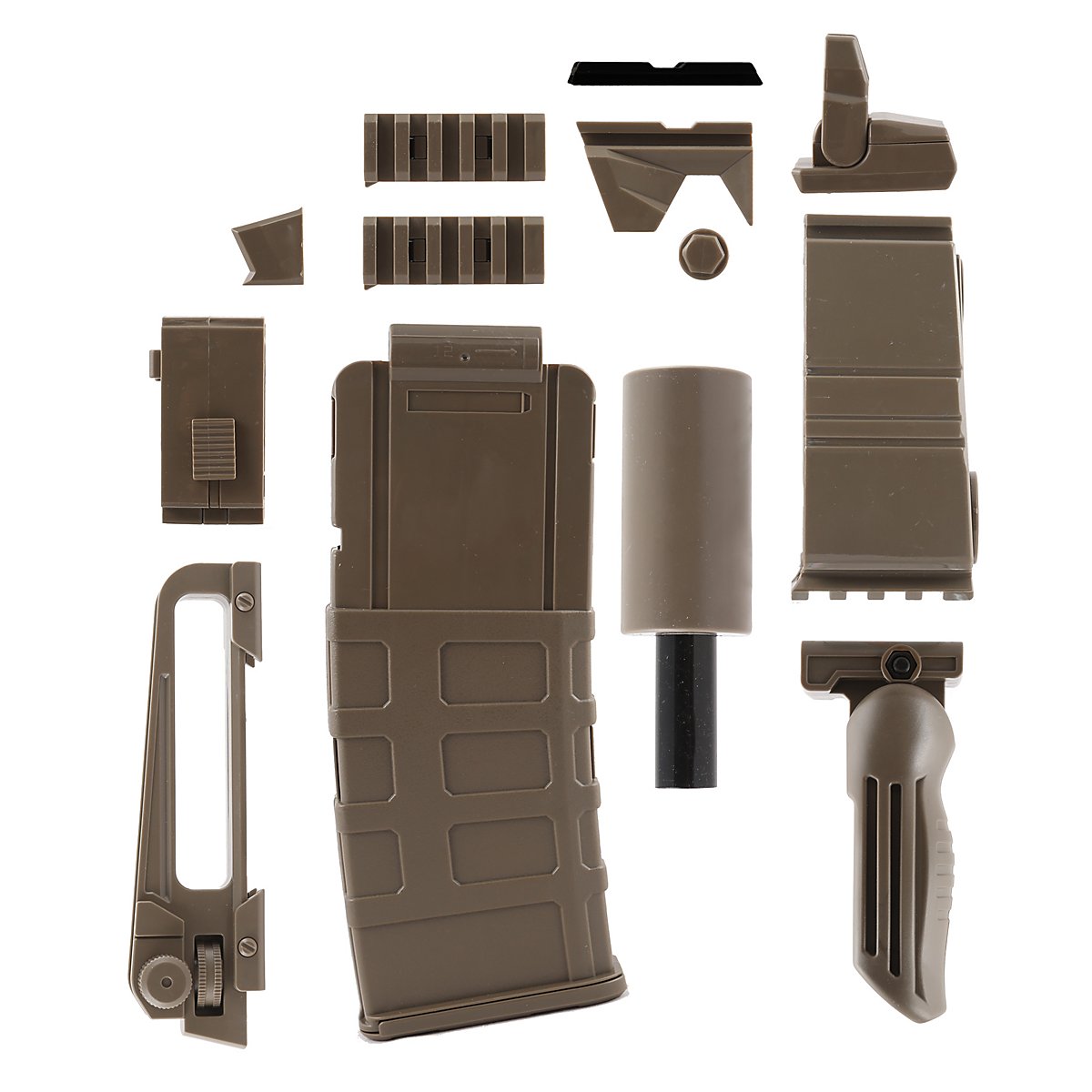 Quando si parla di kit di carrozzeria o di kit di modifica per i blaster, spesso si intendono parti aggiuntive. Di solito vengono assemblati in un kit completo. Un kit tipico consiste in un poggia spalla, una canna anteriore e un mirino. In alcuni casi, vengono aggiunte piccole parti di riempimento ("gap closers"), caricatori, impugnature, mirini posteriori e anteriori. Lo scopo di un body kit è quello di imitare un certo aspetto. Di solito è modellato su un'arma del mondo reale. Tuttavia, il nuovo look non è permanente. Può essere ricostruito a piacimento. Consigliamo a tutti gli appassionati di provare una volta con un kit!