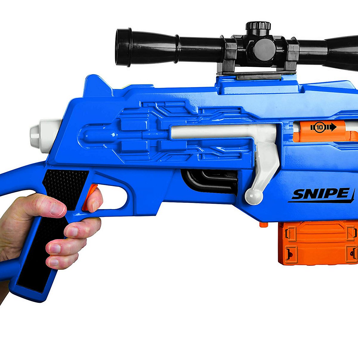 Il meccanismo bolt-action è divertente da usare, ha un aspetto fantastico e si abbina perfettamente a questo affidabile fucile da cecchino. La leva di armamento è facilmente accessibile, scorrevole e ben dimensionata. Grazie all'estensione della canna, il blaster ha un'impressionante lunghezza complessiva di poco più di 90 cm. Il diametro della canna è abbastanza grande da non influenzare i dardi in volo. Il blaster è compatibile con i dardi e i caricatori NERF e, come già detto, i modelli Air Warriors Ultra-Tek di Buzz Bee sono compatibili con i dardi e i caricatori di altri produttori: un grande vantaggio per i giocatori di ruolo dal vivo e per i guerrieri d'ufficio che vogliono essere più flessibili con il loro equipaggiamento.
