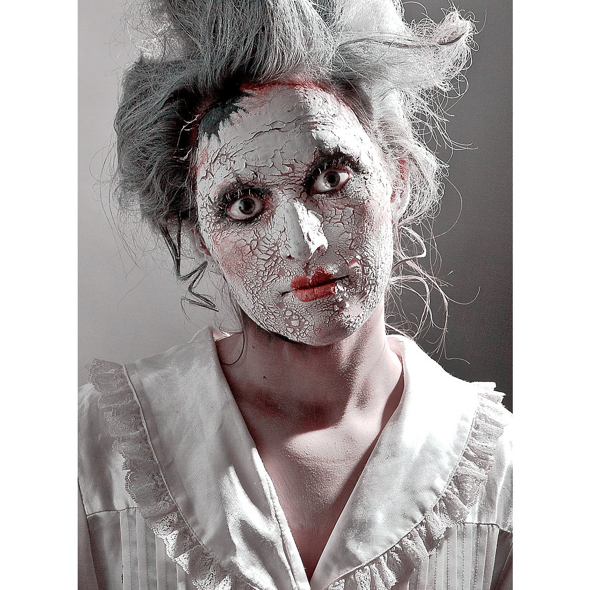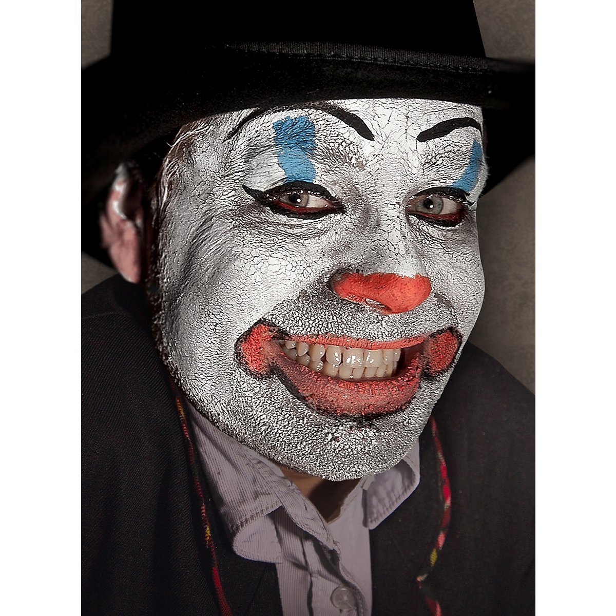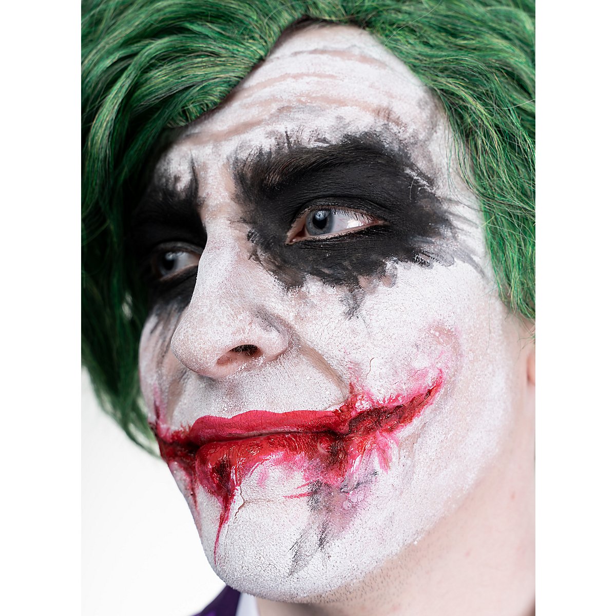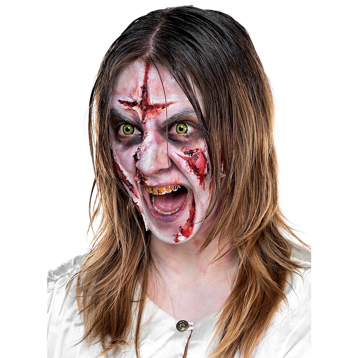 Con Scary Skin white di maskworld puoi creare in modo semplice e veloce effetti spaventosi di carne in decomposizione e pelle di mostro. Applica la pasta cremosa dal tubetto in strati sottili e lascia asciugare o usa un asciugacapelli. Dopo l'asciugatura, l'effetto pelle si lacera e si rompe, creando inquietanti crepe. Puoi anche applicare la pelle spaventosa in più strati per ottenere applicazioni più spesse. Se poi muovi e stiri molto la pelle, singoli pezzi si staccheranno e faranno sembrare il tuo viso ancora più disintegrato! Tampona la pelle spaventosa molto spesso per ottenere effetti cromatici più intensi o mescolala con il trucco, ad esempio il trucco acqua di maskworld, per ottenere le tue tonalità di colore.