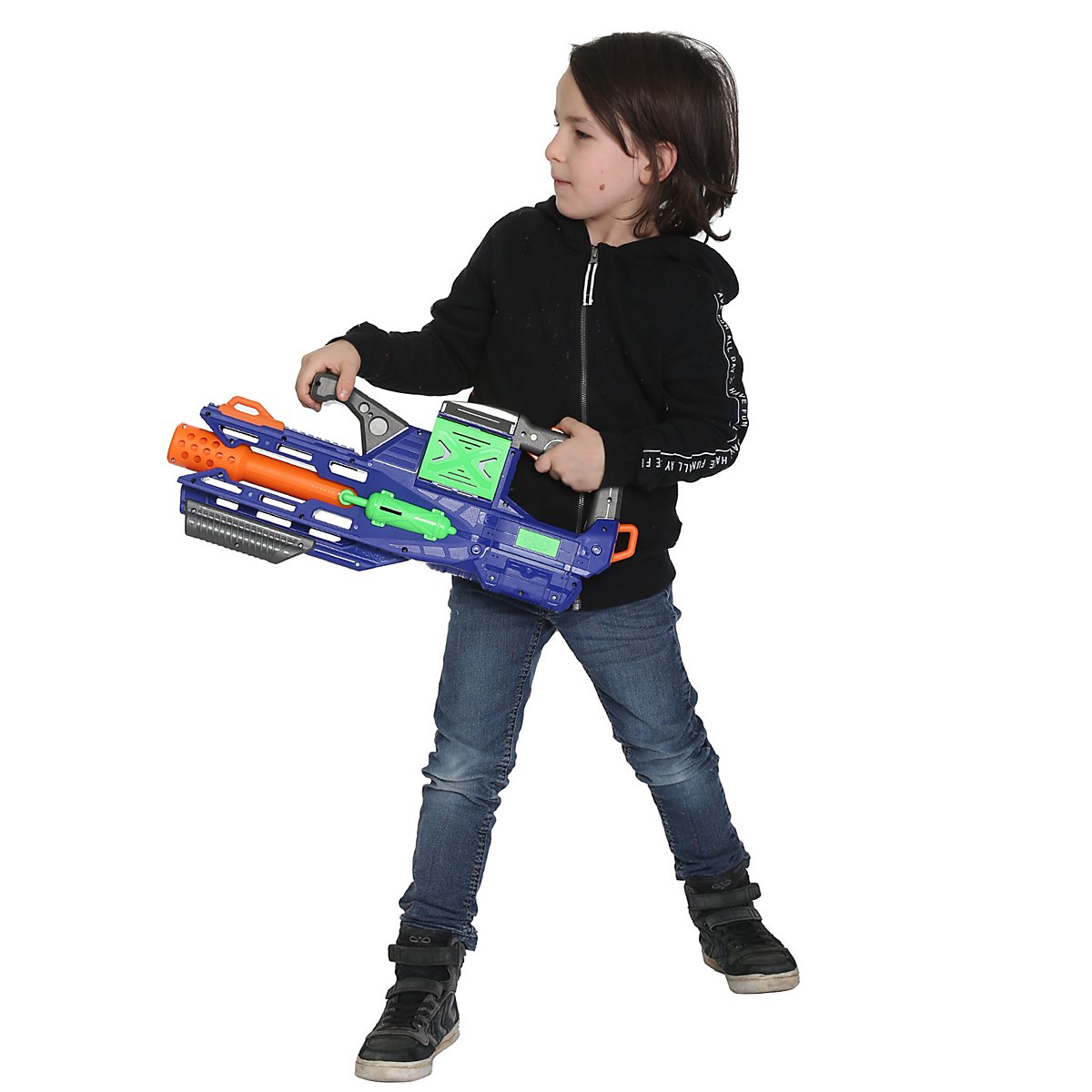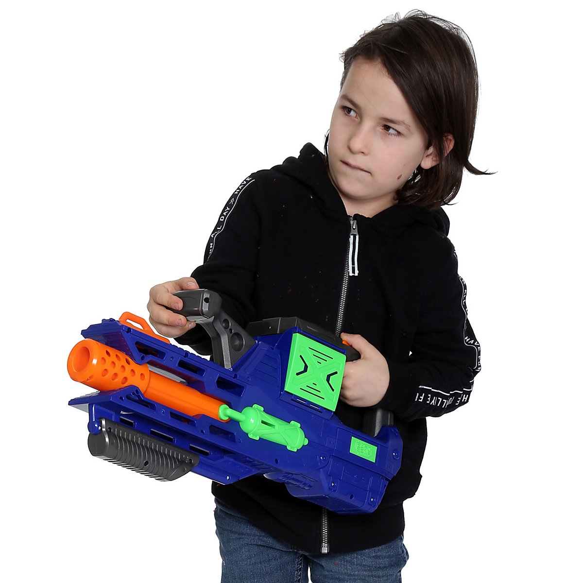 Questo blaster completamente automatico è il sogno di ogni appassionato d'azione e offre pura adrenalina! Con la sua cadenza di fuoco incredibilmente elevata, puoi scatenare senza sforzo un'ondata di dardi di schiuma sui tuoi bersagli. La precisione passa in secondo piano quando lanci un tale volume di schiuma in aria – un colpo è quasi garantito! Scopri la potenza del Dart Zone Destructor e domina ogni campo di battaglia.