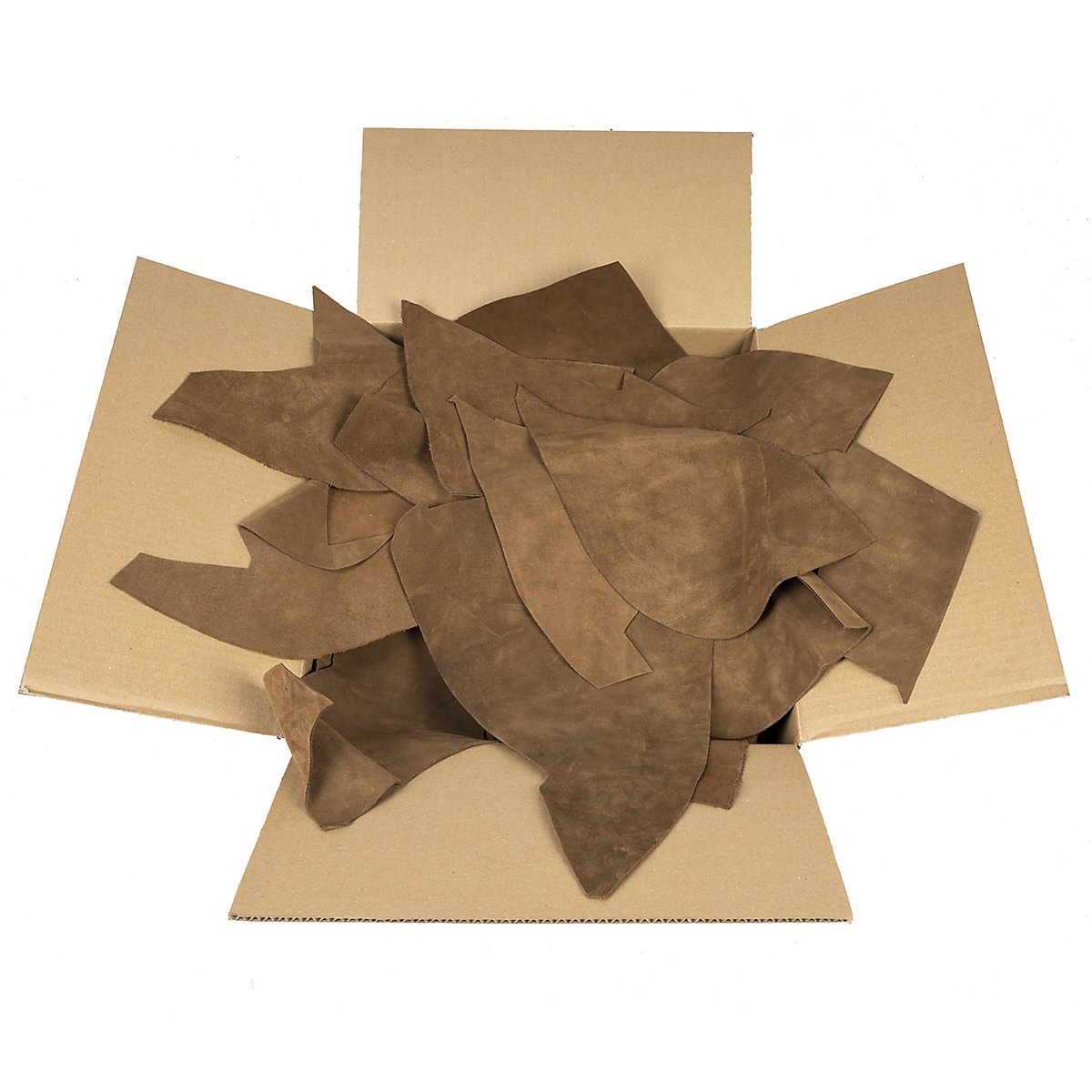 La dimensioni dei pezzi variano tra i 20 cm e i 60 cm di lunghezza. Le forme degli scampoli di pelle sono molto diverse. Gli scampoli di pelle scamosciata sono disponibili anche nei colori nero, marrone e verde.